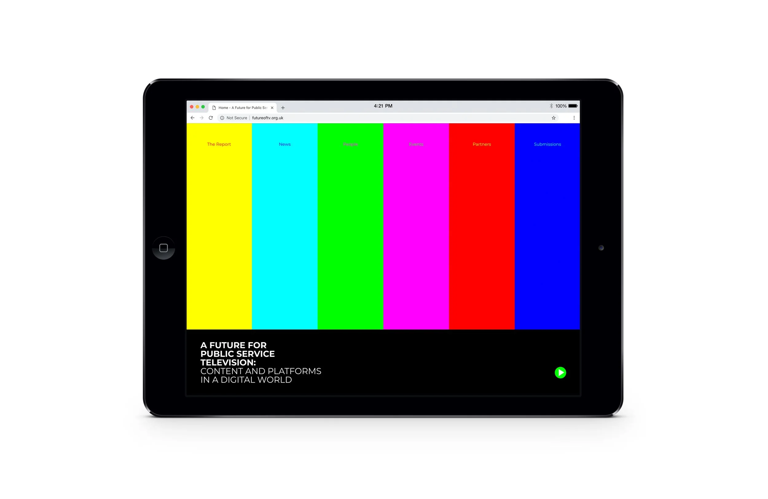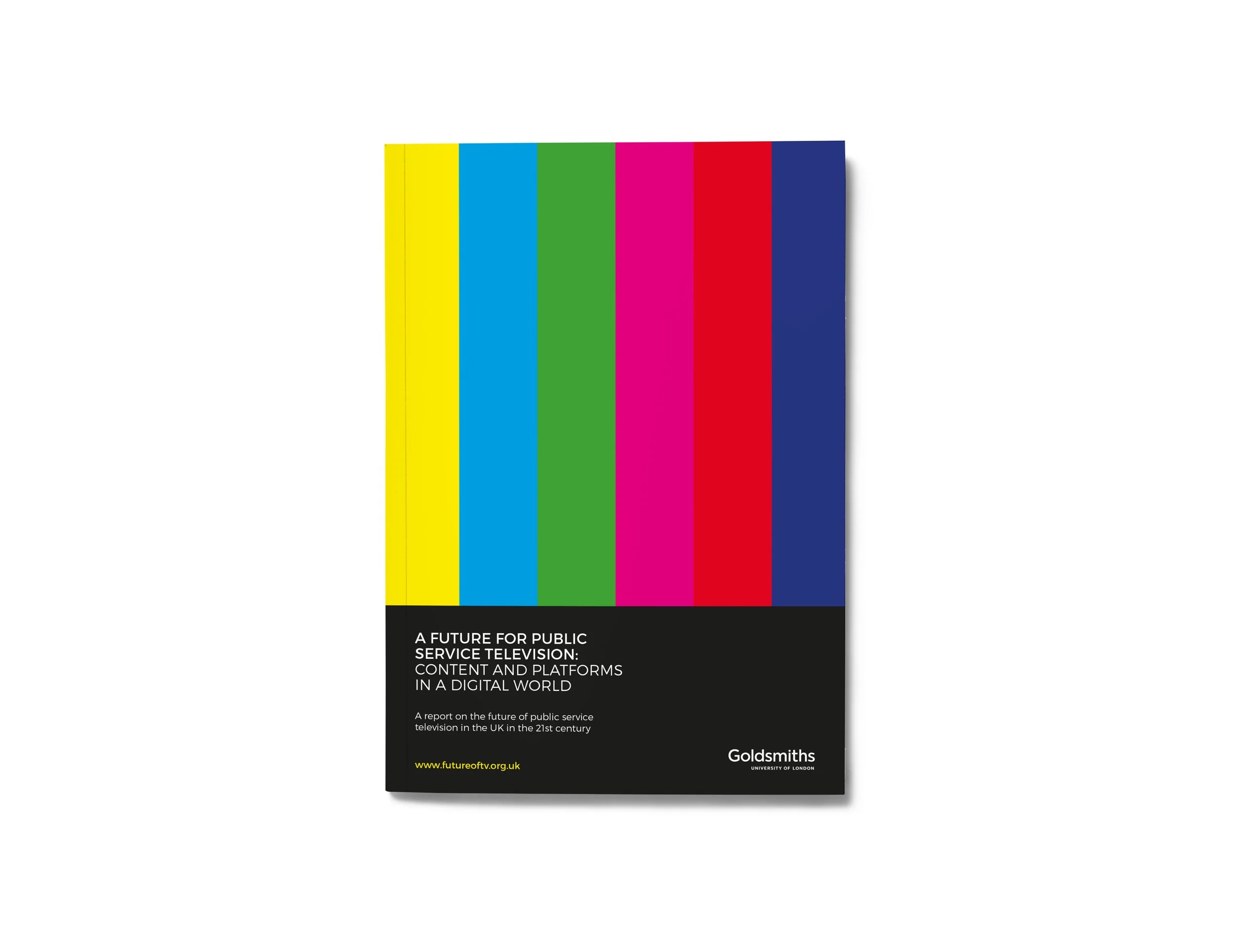 In 2016, a public inquiry was set up to consider the nature, purpose and place of public service television today and for the future. The project was staffed by Goldsmiths, University of London who briefed me to create an identity for the inquiry, and various applications including a website, marketing materials and the full report publishing the outcomes of the inquiry.
